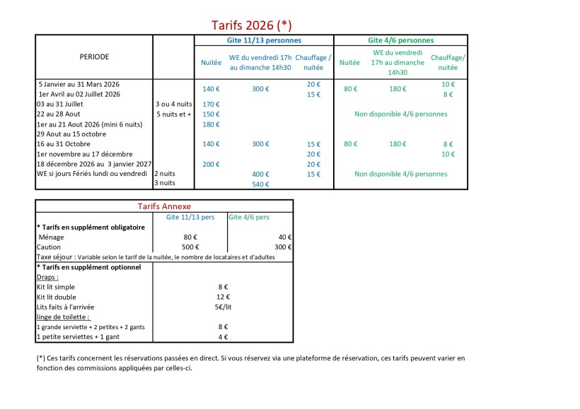 Gîte ouvert à la location toute l’année pour une capacité de 11/13 personnes (gîte complet) ou 4/6 personnes (1/2 gîte).